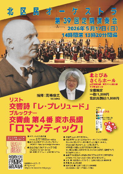 北区民オーケストラ・リハーサル 北区民オーケストラのリハーサルが、障害者とその付添人を対象として無料公開されます。 【日時】令和8年5月16日(土)1800(開場1730) 【場所】北とぴあ さくらホール 【演奏】北区民オーケストラ(本番前日のリハーサル) 【指揮】高橋俊之 【曲目】リスト 交響詩「レ・プレリュード」 ブルックナー 交響曲第4番「ロマンティック」 【その他】要申込み(下記リンク)