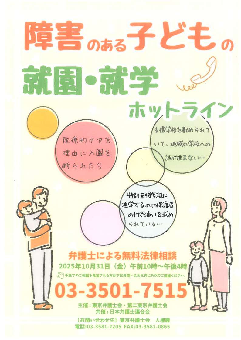 発達に課題のある子どもが就学・就園する際には、自治体に「就学相談」をすることが主流ですが、例えば地域の公立小学校に子どもを入れたいのに支援学校を勧められて話が進まない、、、などということがあります。こうした場合の対処などについて、弁護士会が相談ホットラインを準備しています。